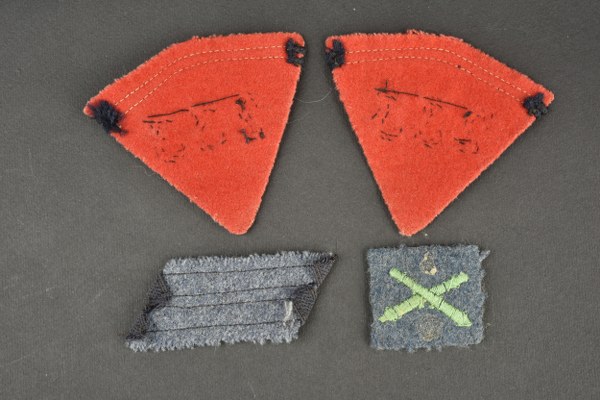 Ensemble de pattes de col du 233ème RA. Comprenant une paire de pattes de col troupe pour capote modèle 1915, chiffre noir sur drap de laine garance. Un grade bleu horizon ainsi qu'un insigne de canonnier. Etat II+