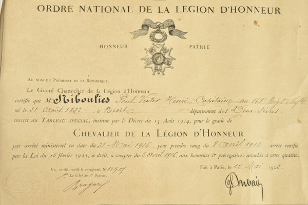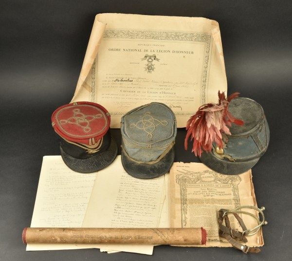Ensemble du capitaine Niboulies. Ensemble récemment sorti de grenier d'un capitaine ayant notamment servi au 163ème RI. Comprenant son shako de l'école spéciale militaire, basane présente mais doublure interne absente, l'insigne est monté d'origine, les aérateurs sont présents ainsi que son plumet, plusieurs trous de mites. Son képi polo de capitaine du 163ème RI, bandeau en drap noir, chiffres brodés cannetilles, jugulaire absente et intérieur accidenté. Son képi de capitaine bleu horizon, confectionné en drap bleu horizon d'officier, galons en coton blanc, fausse jugulaire dorée avec boutons de l'infanterie. Sa paire d'éperons. Son diplôme de chevalier de la légion d'honneur attribué le 12 mai 1932 dans son écrin nominatif. Un bulletin des armées et des citations à l'ordre de l'armée. Une quinzaine de documents dont des ordres d'opérations sur le secteur de l'Aisne ainsi que des notes de service. On y joint une copie l'intégralité des recherches effectuées sur l'officier. Etat II+