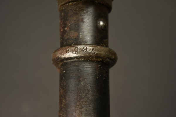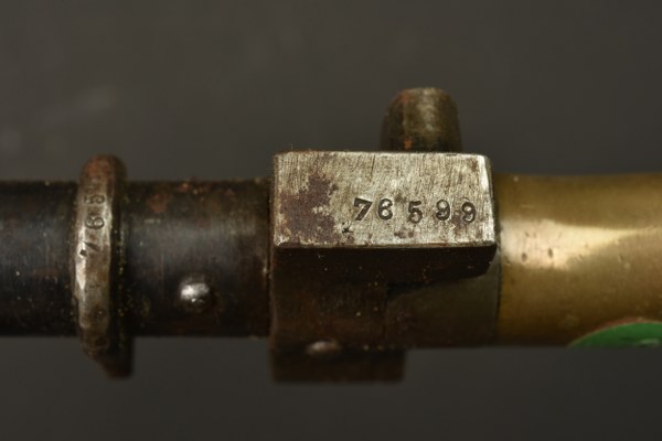 Baïonnette Rosalie modèle 1886 arme et fourreau au même numéro. Poignée laiton sans quillon, poussoir fonctionnel. Lame cruciforme dans sa longueur. Fourreau fer avec oxydation, à nettoyer. Arme et fourreau au même numéro de série II