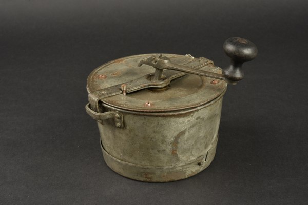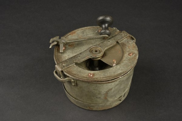 Moulin à café Klepper. Moulin à café de Poilu, avec son tamis, son plat inférieur, sa manivelle. Têton d'ouverture du clapet remplacé. Bon état II