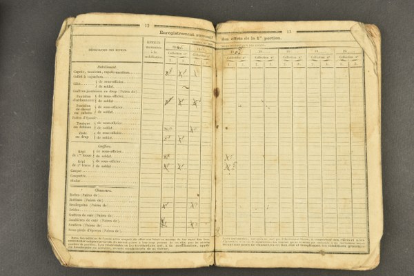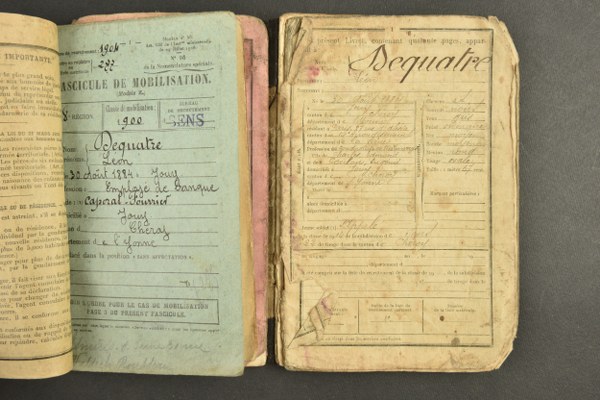 Ensemble de médaille, documents, diplomes et citation d'un soldat du 4e BCP. Comprenant une croix de guerre encadrée avec palme et étoile, livrets militaires, certificats de bonne conduite et de service militaire et citation à l'ordre du 4e Batailon de Chasseurs à Pied du 3 juin 1917. Un faire part de décès du Lieutenant Colonel Driant. Patine, usure II