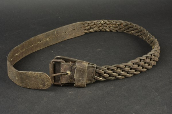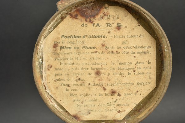 Lot d'équipement français 1e Guerre. Comprenant un étui de masque ARS avec son étiquette intérieure, un ceinturon tressé, une boîte de cirage Paulin, une lampe pigeon de tranchée, une boîte Ancel, boîte d'allumettes, miroir, patience, blague à tabac en bois, nécessaire d'entretien Lebel, une plaque de wagon d'artillerie. Usure, patine II