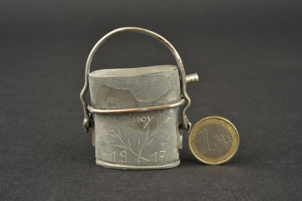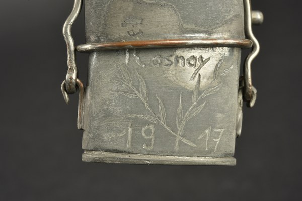 Briquet de tranchée en forme de Bouthéon. En métal blanc, de 4 x 4,5 cm hors anse. Couvercle amovible avec rmollette en dessous. Anse articulée faisant office de blocage du couvercle. Corps gravé Rosnay 1917. Patine II