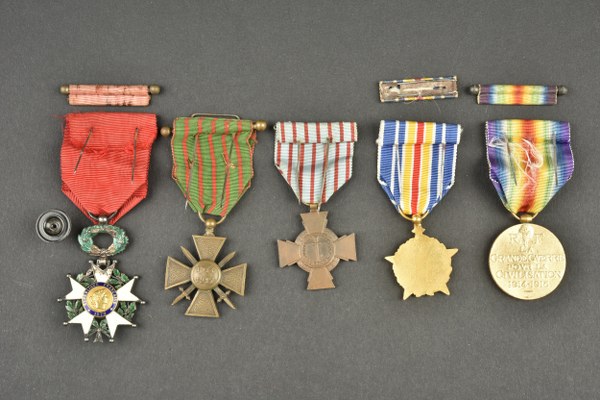Ensemble de 5 médailles de la 1ère Guerre. Constitué d'une croix de chevalier de la Légion d'Honneur, avec manques d'émail, avec rappel et insigne de boutonnière, une croix de guerre 1914-1917 avec 2 citations, une Croix du Combattant, une médaille commémorative interalliés de la Victoire avec rappel, et une médaille des blessés militaires avec rappel. Usure, patine, insolation des rubans II