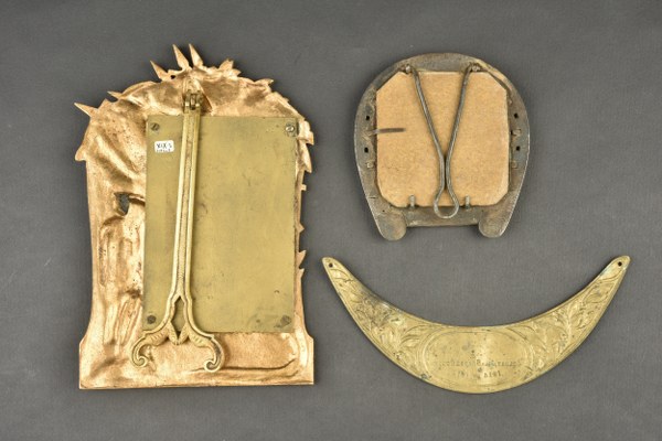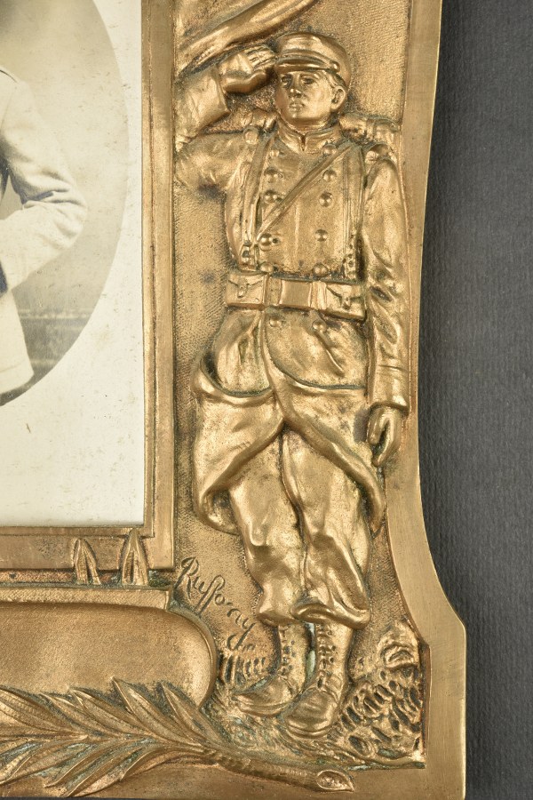 Lot de 2 portes photo de soldats des Chars de Combat. Un porte photo laiton avec photo d'un soldat du 551e RAS ou RCC, un porte photo en forme d'étrier d'un soldat du 509e, et une plaque soldat de la Grande Guerre II