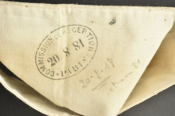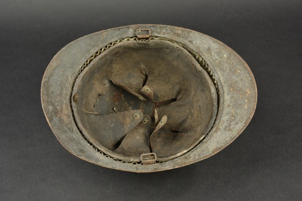 Casque Adrian 1915 infanterie. Casque modèle 1915, attribut d'infanterie modèle 1915, peinture du second type recouvrant le bleu horizon d'usine. Coiffe du premier type à sept dents de loup dont une accidentée, quatre gaufrettes en aluminium. A noter un choc sur le dessus du casque ainsi que deux trous sur la visière destinés à y visser une plaque commémorative. On y joint un brassard du service de santé tamponné du premier corps d'armée et daté du 20 août 1881. Etat II+