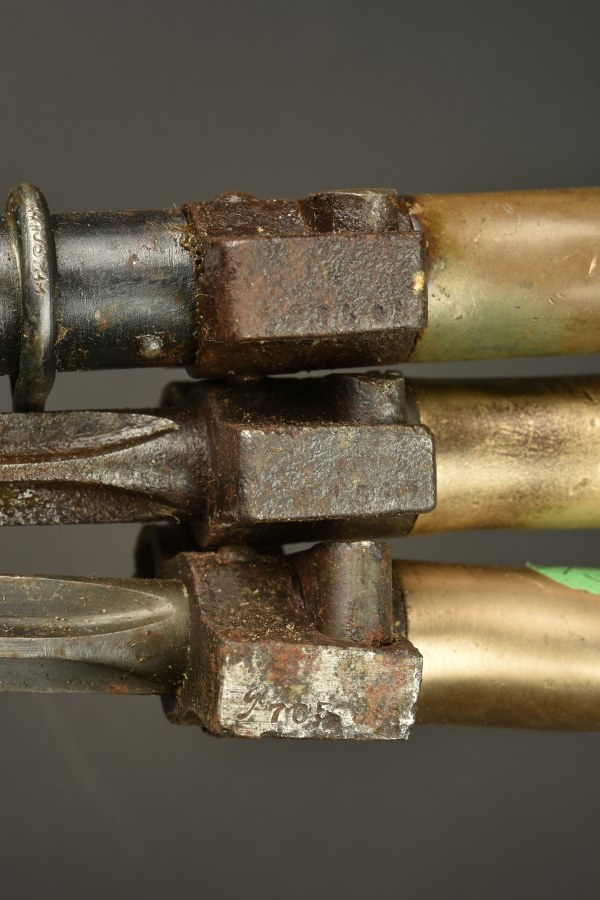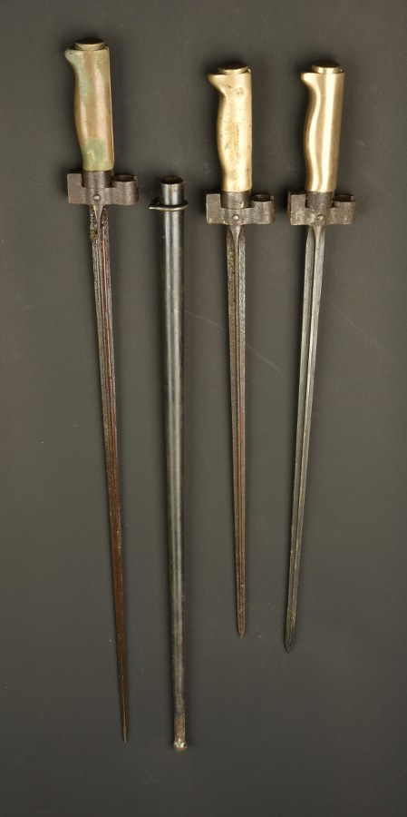 Lot de 3 baïonnettes Lebel 1886. Toutes à poignée laiton sans quillon. Une dans sa longueur avec fourreau. Deux autres sans fourreau, lames raccourcies respectivement à 400 et 383 mm. Oxydation, usure, graisse II-