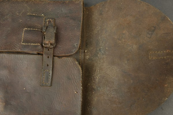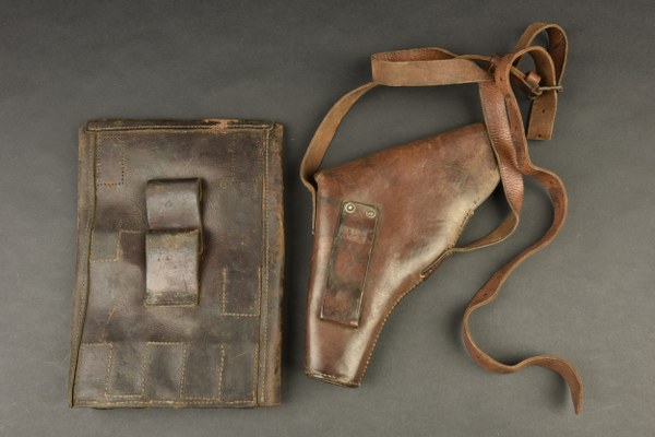 Sacoche et étui pour pistolets lance fusée français. Sacoche pour modèles 1917 et 1918. Fabriquée après 1918. En cuir marron, à 2 volets et 1 rabat. Avec ses logements internes. Sangle de transport absente. Pas de marquage visible Etat moyen. Etui pour PLF en cuir fauve, avec sa sangle de transport, pas de marquage visible II