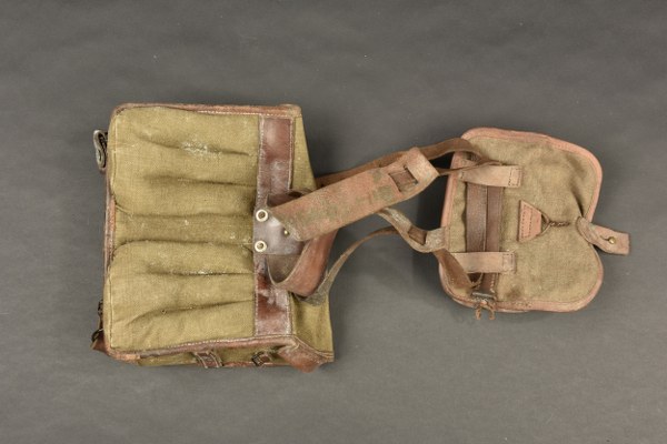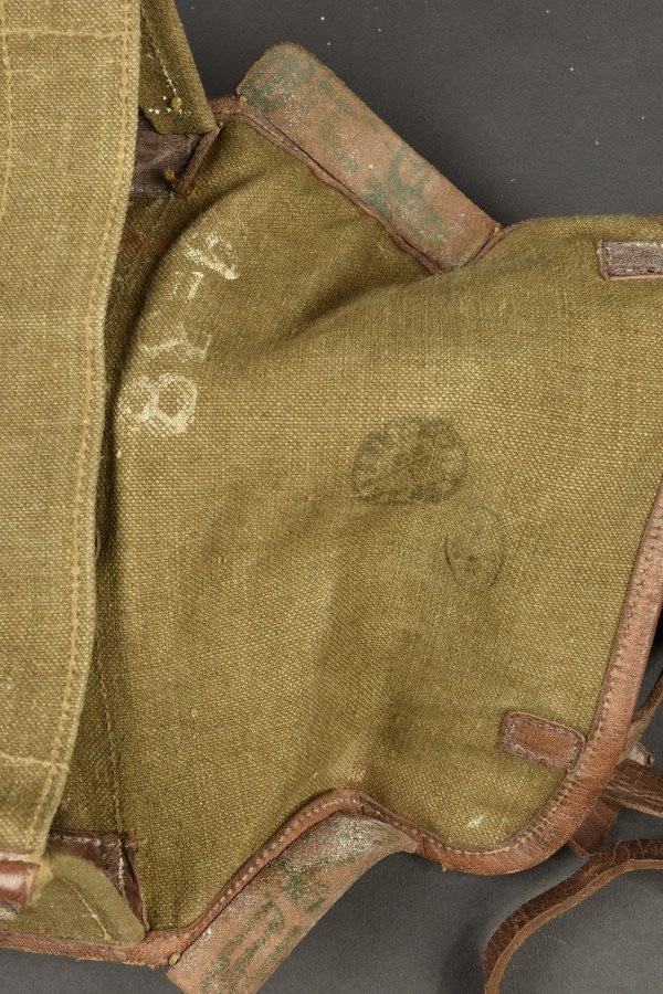 Ensemble FM 24/29. Comprenant un havresac modèle 1924 confectionné en toile kaki, la matelassure est toujours présente, sangle en cuir d'origine non recoupée. Les compartiments internes sont cousus d'origine, tampon indiquant la date 9.38. Effet neuf de stock. Est fixé sur la sangle une cartouchière de tireur modèle 1924 avec ses passants et son crochet de suspension, téton présent mais arraché. Etat II+