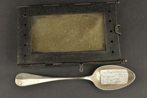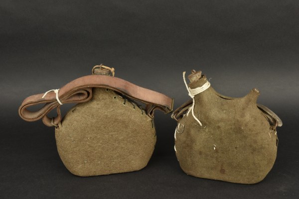 Lot d'équipements français. Comprenant un bonnet de police en drap kaki portant un galon, une gourde modèle 1935 avec sa housse kaki et sa sangle, lacet postérieur. Une gourde modèle 1877 avec housse kaki et sanglon modèle 1935, cordelette postérieure. Une lanterne Montjardet avec verres postérieurs. Un brassard d'infirmier américain retamponné par l'armée française. Un képi de sous lieutenant pharmacien modèle 1935, bandeau en drap vert, boutons avec caducé. Une cuillère avec marquage du 22ème Dragon. Un bas de gamelle britannique gravé par le soldat Maillard reprenant tout son parcours de prisonnier. Etat II-