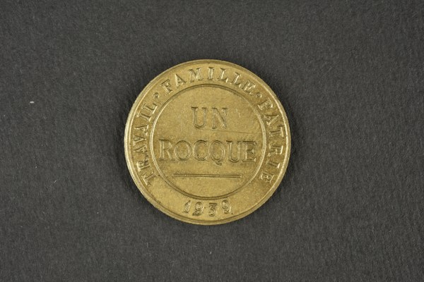 Monnaie PSF de la Rocque. Monnaie éditée par le PSF portant sur une face Un Rocque Travail Famille Patrie 1939 et sur l'autre Reconcilliation Française avec le flambeau surmontant la France. Diamètre 28mm. Etat II+