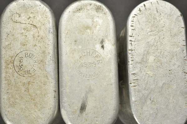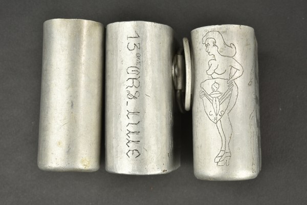 Ensemble de quarts gravés. Comprenant deux quarts modèles 1935 ayant appartenus à André Honoré, un entièrement gravé portant des décors de femmes nues dont deux tenant les emblèmes de la CRS 11 et possédant l'insigne de la CRS 13 de Lille. Un quart modèle 1935 daté 1939 d'un soldat de l'infanterie coloniale portant l'inscription Souvenir de captivité. Etat II+