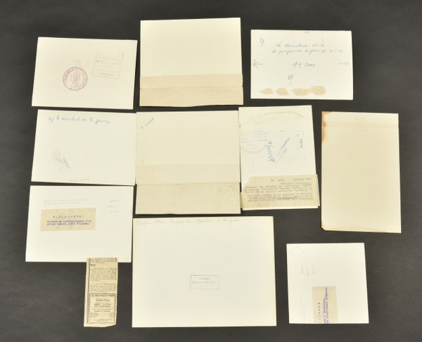 Ensemble de photos des Voyages du Maréchal. Comprenant une photo grand format 24x18cm, du Maréchal en Visite à Avignon en 1942, accompagné de du Général Jean Bergeret et René Bousquet. Une photo au format 18x13cm de René Bousquet au cours de sa visite au Foyer des enfants du personnel de la Police. Une photo au format 18x13cm de René Bousquet à Périgueux en visite au centre d'éducation Physique et Sportive de la Police Nationale. Une photo au format 18x13cm, du Maréchal saluant des mouvements de Jeunesse. Une photo au format 18x13cm du Maréchal accompagné de Darland lors d'une manifestation agricole et tamponnée au dos par le cabinet Civil du Chef de l'Etat Bureau de Documentation et d'archives privé. Une photo au format 18x13cm du Maréchal accompagné du Commissaire Général Joseph de La Porte du Theil lors d'une visite au groupement de jeunesse 21. Une photo au format 18x13cm intitulée "Les offrandes des Compagnons au Maréchal" représentant le Maréchal en visite dans la clairière de Randan lors du rassemblement de 5000 Compagnons à l'occasion du 2ième Anniversaire de la Fondation du Mouvement des Compagnons de France. 2 photos de colonnes Nomades prises lors de la Mission de Maurice Noel en Afrique Occidentale Française tamponnées du Service Cinéma de l'Armée. Une fiche vierge du centre d'information et de renseignements . Etat II+