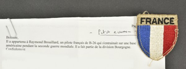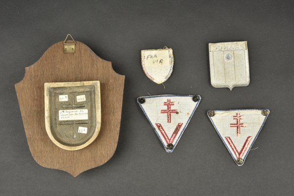 Ensemble France Libre. Comprenant une plaque souvenir en bronze FFI du 1er Régiment de chasseurs vosgiens, deux inisgnes de poitrine FFI dont un possédant un grade, une plaque en aluminium représentant le drapeau français et un insigne France en tissu de fabrication américaine attribué par le collectionneur au pilote Raymond Brouillard. Etat II+