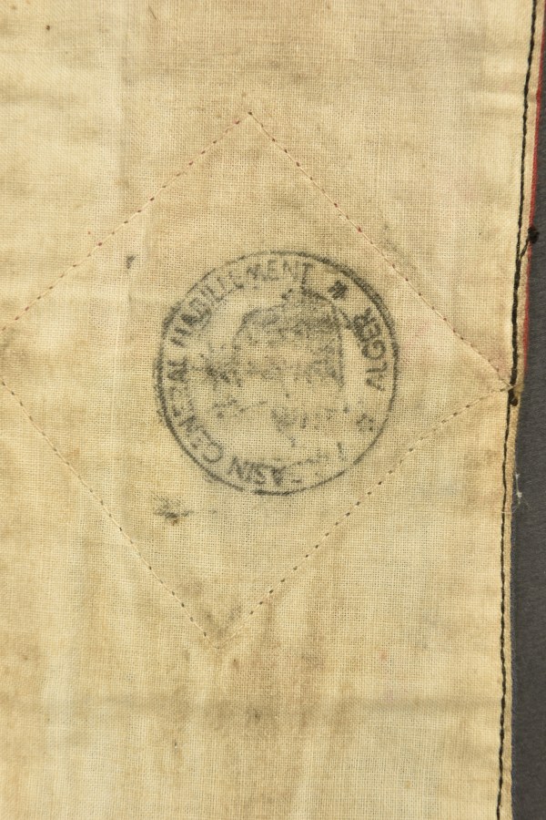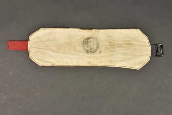Brassard résistance Alger. Brassard tricolore portant au centre la croix de Lorraine imprimée sur un carré de coton blanc. Boucle de réglage cousue d'origine, tampon sur la doublure indiquant Magasin Général de l'habillement à Alger. Etat II+