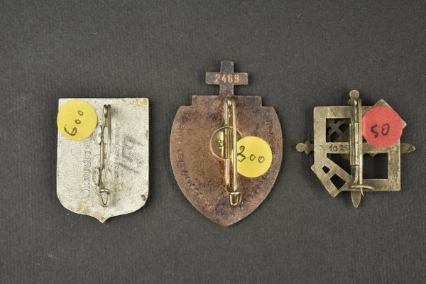 Lot d'insignes FFI. Comprenant l'insigne du 1er bataillon du Jura en aluminium peint de fabrication Augis. Un insigne de l'organisation resistante armée en métal émaillé, accidents, et numéroté 1029. Un insigne FFI Région C, 1944 en métal émaillé avec au revers le numéro d'attribution 2469. Etat II+