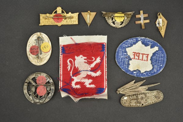 Lot d'insignes FFI et divers. Comprenant un inisgne tissu FFI Quercy, un inisgne brodé FTPF, un inisgne en aluminium peint de la sécurité nationale, un inisgne 10ème division FFI de fabrication allemande, un insigne général FFI, un insigne en métal émaillé OCM et divers. Etat II+
