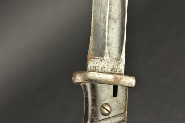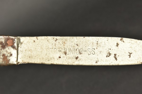 Armes blanches FFI. Comprenant une baionnette 98k raccourcie en poignard de fabrication Horster dans un fourreau en cuir artisanale. Un couteau forgé ayant comme marquage de lame STO Junior SS. Un couteau de lancer avec une poignée en plexiglas, fourreau de type chantiers de jeunesse gravé FFI avec croix de Lorraine. Etat II+