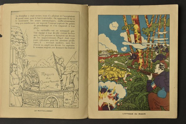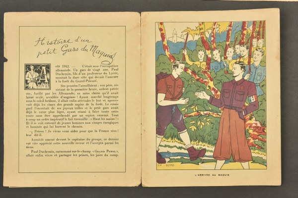 Documents FFI. Comprenant le livret Histoire d'un petit gars du maquis, en couleurs, complet. Un livret Le chant des FFI, un livret La marche des FFI, un tract de menace envoyé par les mouvements unis de la résistance aux sympathisants germanophiles. On y joint le tract Novembre 1939 présentant quelques déchirures ainsi que le tract Safe Conduct. Etat II+