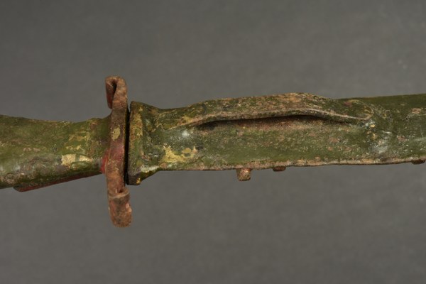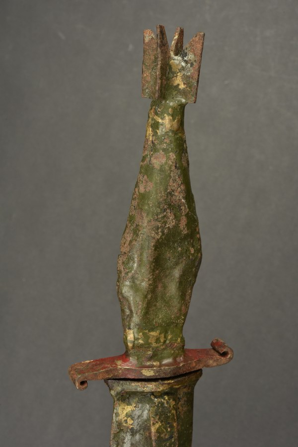 Poignard artisanal FFL. Curieux et spectaculaire poignard artisanal réalisé à partir d'une lame de glaive. Lame à double tranchant, d'une longueur de 24,6 cm. Poignée en métal replié en forme d'obus de mortier, pommeau formé d'ailettes, le tout peint en vert. Le V de la victoire et une croix de Lorraine rapportés, peints en rouge, de même que la garde. Fourreau en métal replié soudé, peint en vert avec les lettres FFL rapportées et peintes en rouge. Sur le fourreau un pontet métallique brasé pour port au ceinturon. II-
