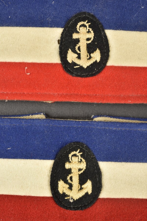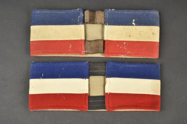 Brassards français. Deux brassard en lainage bleu/blanc/rouge, insigne représentant une ancre de marine brodés et rapportés. Doublure en tissu coton gris. Les élastiques sont relativement souple. A noter une certaine usure et patine de la pièce, ainsi que quelques tâches et traces de mite. Etat II+. 2+