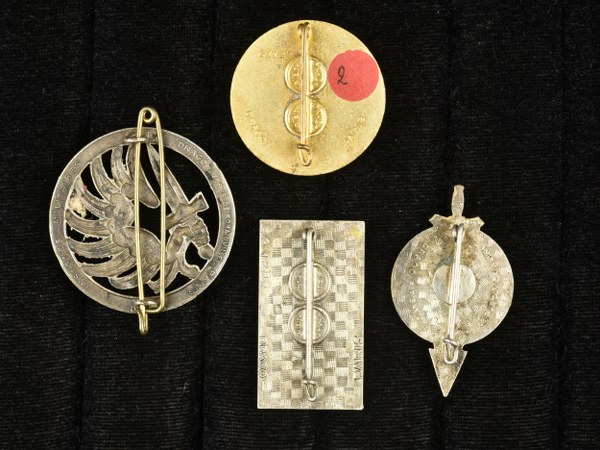 Lot de 4 insignes parachutistes Indochine Algérie. Insigne Demi Brigade SAS fabrication Drago Olivier Metra, Macaron de béret TAP fabrication Drago Romainville, Insigne base aéroportée AFN. On joint un insigne de la 25e Division d'Infanterie Aéroportée. II+
