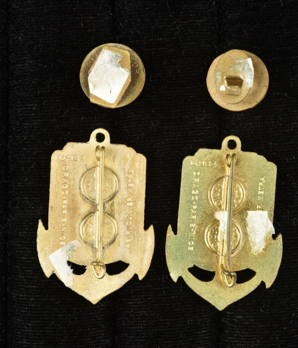 2 insignes Service Social Cinéma Forces Terrestre en Extreme Orient. Modèle avec pélicule argent et modèle avec pélicule dorée. Tous deux fabrication Drago Olivier Metra, avec leurs attaches. On y joint un insigne de boutonnière Ancien Combattant Cinéma et un autre Diffusion Cinématographique Algérie. Bon état II+