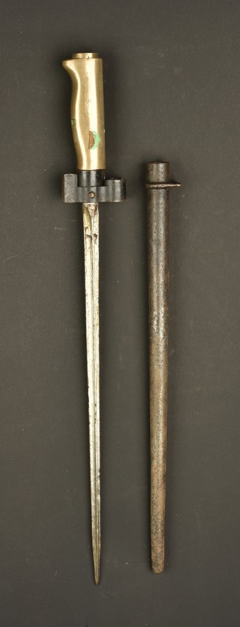 Baïonnette Lebel 1886 raccourcie. Poignée laiton sans quillon. Lame raccourcie à 343 mm, non réalisé en arsenal. Longueur totale de l'arme 461 mm. Fourreau fer raccourci avec terminaison hemisphérique. De part ses dimensions, peut faire penser à un modèle 103(f) de prise allemand mais plus probablement un poignard de combat. Usure, patine, oxydation superficielle du fourreau II