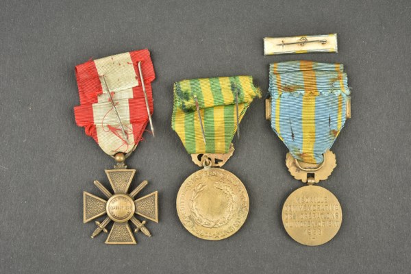 Lot de Médailles Indochine et Suez. Croix de Guerre TOE avec citation, médaille commémorative Indochine, et médaille commémorative des opérations au Moyen Orient 1956 avec agrafe et rappel. Patine II