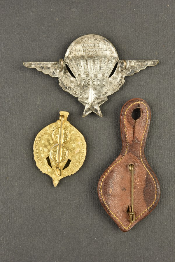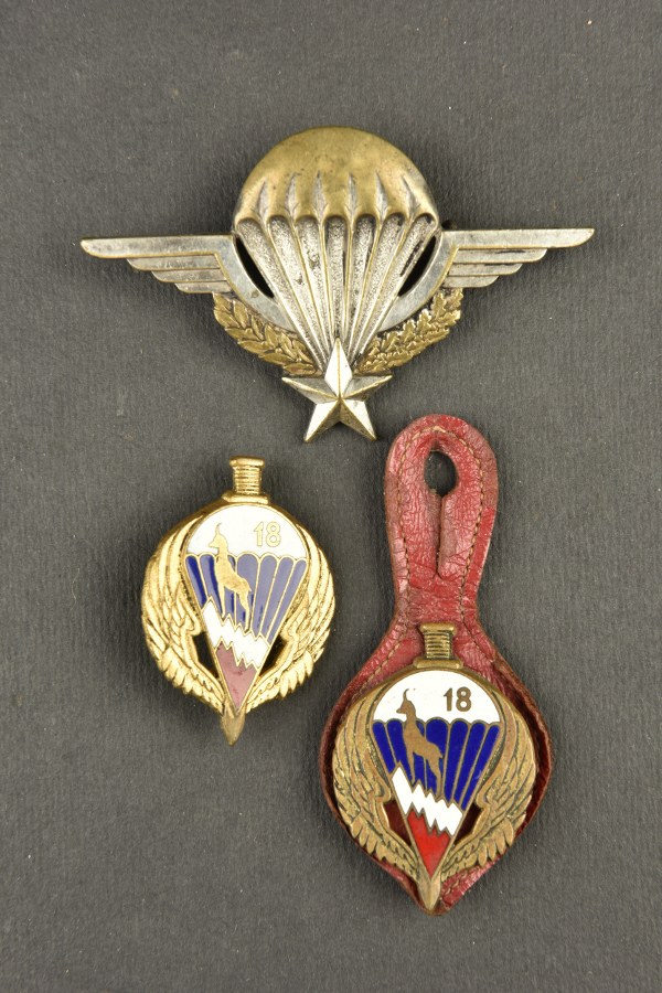 Insignes du 18e régiment d'infanterie parachutiste de choc. Comprenant une écu mural en bois avec une grande figuration de l'insigne du 18e RICP en laiton peint. Ecu 33 x 26 cm, insigne 17,5 x 12 cm. Un insigne du 18e RICP fabrication Drago rue de Romainville avec son attache. Un insigne du 18e RCP Drago Paris avec son attache et son cuir. Un brevet parachutiste de 1960 numéro 178677 II+