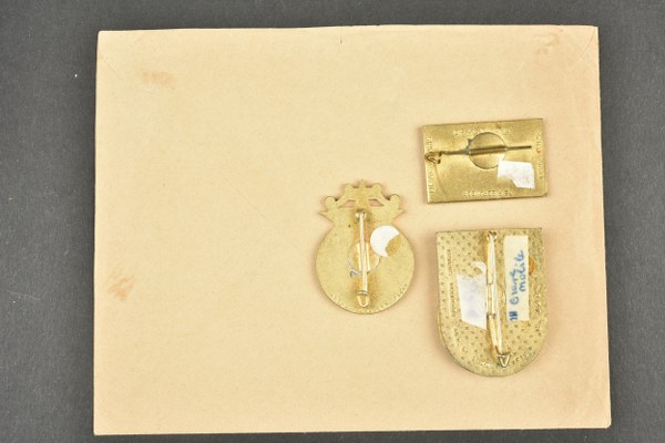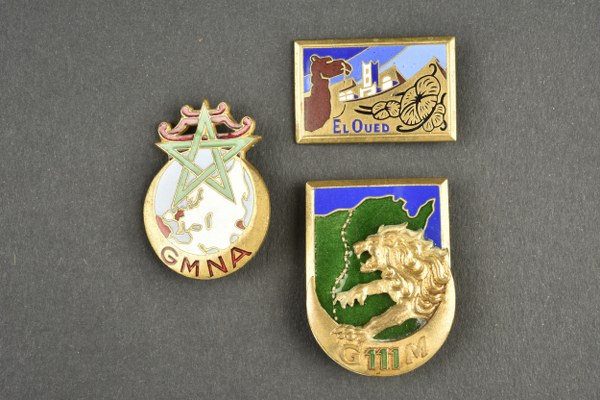 Insignes Groupes Mobiles de Sécurité. Insigne du GM 111fabrication Arthus Bertrand avec son attache, GMNA Groupe Mobile Nord Africain, fabrication Arthus Bertrand avec son attache, et Groupe Saharien d'Annexe El Oued, fabrication Drago rue Beranger, attache cassée. On y joint une enveloppe à entête de l'inspection départementale de Grande Kabylie des GMS II