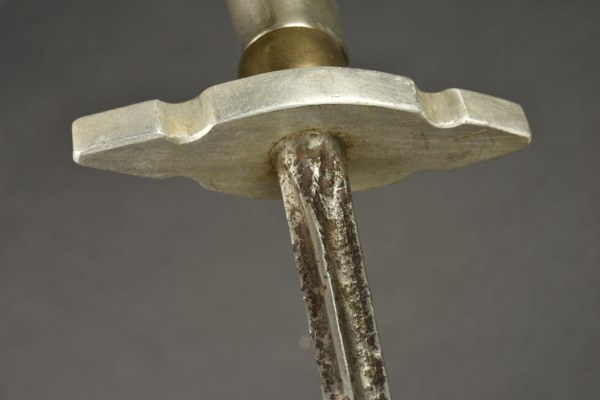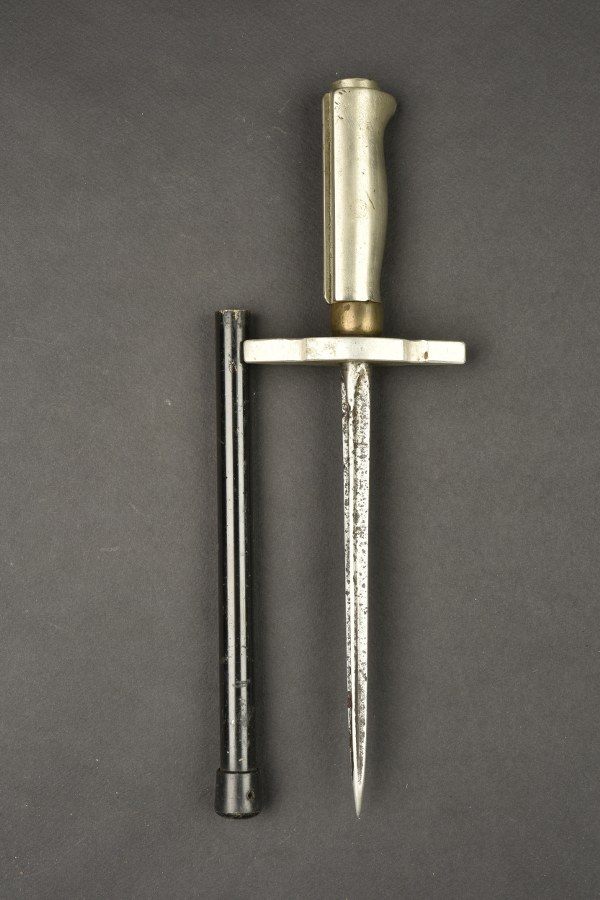 Dague stylet de combat à partir d'une baïonnette M1886. Réalisé à partir d'une baïonnette Lebel 1886, lame raccourcie à 18,6 cm pour une longueur totale de 30,3 cm. Poignée moulée en maillechort. Système de blocage remplacé par une virole en laiton. Garde en aluminium. Fourreau tubulaire en métal laqué noir. Bouterole en plastique noir. Oxydation de la lame II