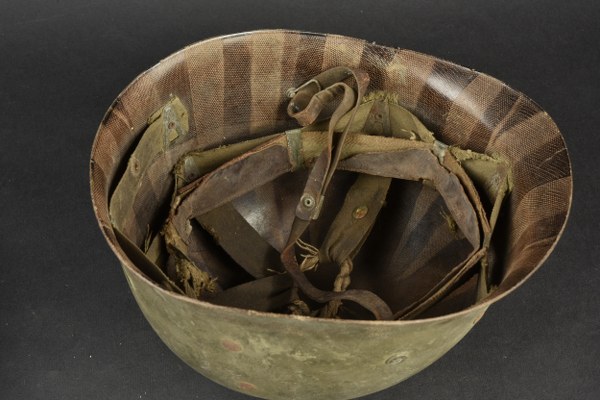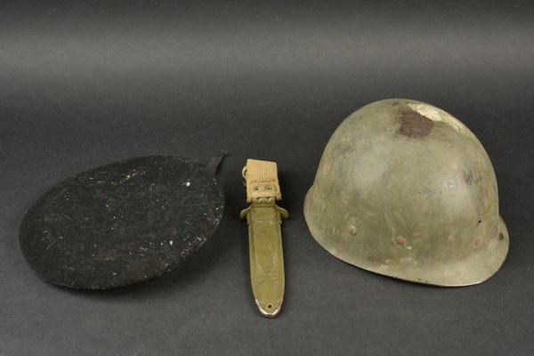 Lot français Indochine-Algérie. Composé d'un liner US Westinghouse réutilisé armée française, un fourreau US M8A1, un béret daté 1956, insigne commandos de l'air 1er type, médaille du Maintien de l'Ordre avec agrafes Tunisie et Algérie, une réduction Médaille avec main de fatima, insigne Marine Tunisie, insigne Commando de chasse L 133 du 1/94 RI II