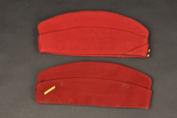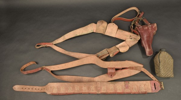 Lot d'équipements spahis. Comprenant un ceinturon cartouchière en cuir rouge strié de fabrication après guerre. Deux cartouchières frontales avec porte baionnette en cuir strié rouge. Un étui de PA MAC50 en cuir rouge daté 1952 avc une répilique de chargeur en résine. Une bretelle en cuir rouge strié. Une paire de nails datées 1958. Un bonnet de police du 4ème zouave et un de spahis. Une gourde américaine avec housse réalisée terrain en djallaba muraille. Un porte cartes de conception Afrique du Nord en cuir recouvert de boutons. Un casque colonial fabriqué à Rabat. Etat II+
