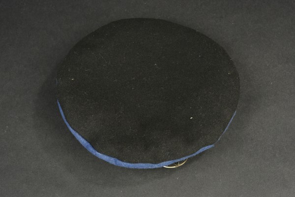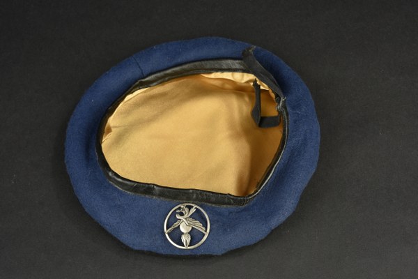 Bérêt Commando de Chasse Gendarmerie. Rare bérêt en trois parties porté en Algérie, confectionné pour la partie inférieur en drap bleu gendarmerie et le plateau en drap noir. Basane en fin cuir noir, doublure en satinette dorée, insigne de fabrication Augis sans marquage avec épingle à boléro oblong . Etat II+