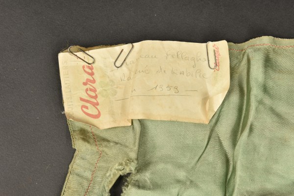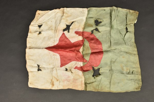 Drapeau du FLN. Confectionné en soie verte et blanche, croissant et étoile en soie rouge. Etiquette en papier portant la mention drapeau Fellagha ramené de Kabilie en 1959. Dimensions 55x43cm. Nombreux trous. Etat II-