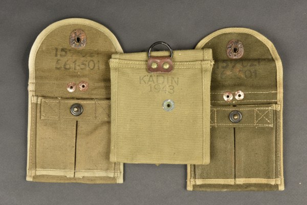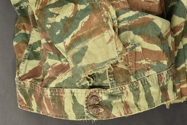 Lot Commando de Chasse. Comprenant un blouson de type commando de chasse en toile camouflée 47/56, bouson à deux poches de poitrine, petite patte de serrage au col. Un short camouflé conftionné dans une une toile de tente, deux poches de fesses. Trois porte chargeurs d'USM1 de fabrication allemande de dommage de guerre. Un porte chargeur US de fabrication Kadin 1943 modifié par l'armée française. Une replique en résine de PA MAC 50. Etat II+