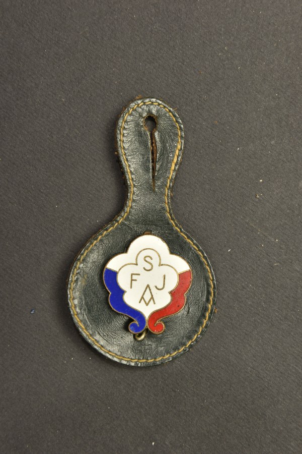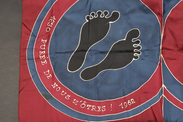 Foulard pieds noirs. Fabriqué pour l'association des pieds noirs composé de deux quatre carrés et portant la mention 1830 Purée de Nous Z'otres 1962. Dimensions 80x75cm. On y joint un insigne du service de formation de la jeunesse en Algérie, fabrication Arthus Bertrand en métal émaillé possédant un petit éclat. Etat II+