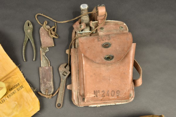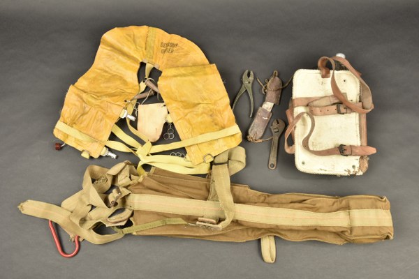 Lot d'équipements de vol. Comprenant une trousse EL3 pour largueur avec une clé, une pince et un couteau de largueur de fabrication civile, verrouillage du rabat accidenté, toutes les sangles sont présentes. Un coupe sangles dans son étui en cuir, un gilet de sauvetage Aerazur type 101P daté juin 1969, avec ses sangles en caoutchouc (sec). Une gaine de saut parachustiste pour arme longue d'époque guerre d'Algérie. Etat II+