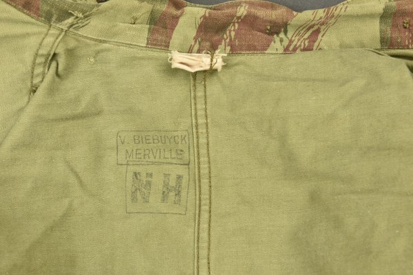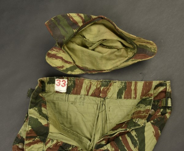 Lot TAP. Comprenant une veste 47/56, fermetures éclaires fonctionnelles, pressions fonctionnelles, élastiques aux bas des manches, œillets d'aération aux aisselles. Pantalon 47/56 en taille 33, pas d'œillets d'aération aux poches, deux poches de fesses, élastiques aux bas des jambes, pressions fonctionnelles. Une casquette type Bigeard camouflée. Quatre capuches TAP 47/56. Etat II+