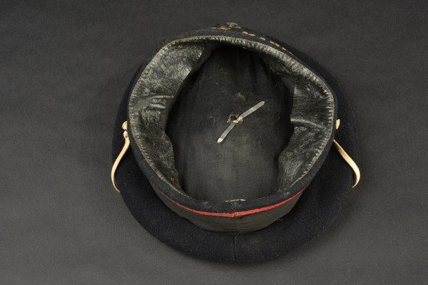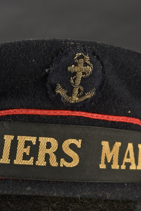 Bâchi de la Marine Nationale Française. En drap bleu marine. Ancre de marine en cannetille or sur fond en drap bleu marine. Bandeau marqué Fusiliers marins. Pompon en laine rouge. Intérieur doublé en satinette noire. Bandeau de sudation en cuir noir. Sans marquages visibles. A noter une certaine usure et patine de la pièce, ainsi que des tâches. Etat II+. 2+