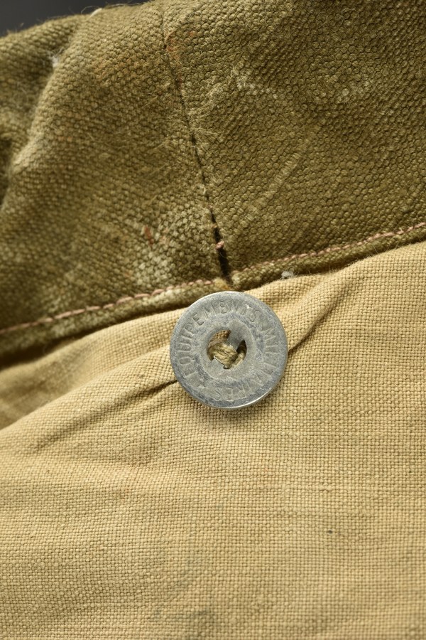 Paletot français. En épais tissu kaki. Tous les boutons sont présents. Intérieur doublé en tissu coton beige. Les marquages intérieurs sont illisibles. La couleur externe présente des marques d'usures de couleur blanche. A noter une certaine usure et patine de la pièce, ainsi que des tâches et accrocs. Etat II+. 2+