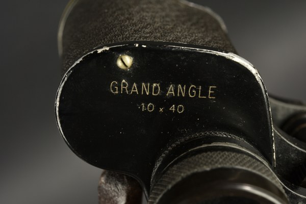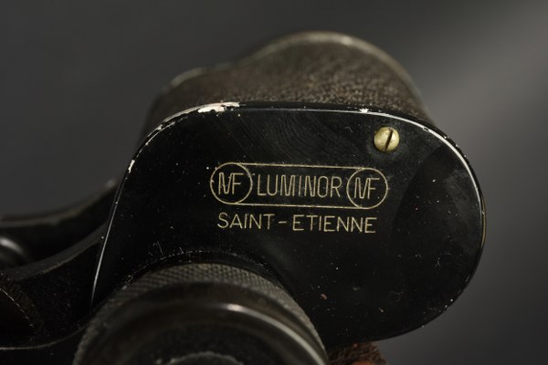Jumelles française. Revêtement en très bon état. La sangle de transport en cuir est présente. Marquages Grand Angle 10x40 NF Luminor Saint Etienne. Optique claire présentant quelques tâches. A noter une certaine usure et patine de la pièce. Etat II+. 2+