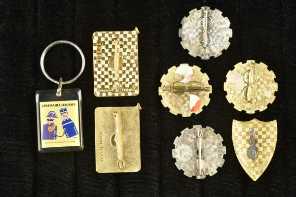 Lot de 7 insignes Services Cinématographique et Photographiques des Armées. Un insigne SCA sans attache, 2 insignes ECPA. Insignes de spécialités Dépanneur, Opérateur, Caméraman, Photographe. En bon état avec leurs attaches. On y joint un porte clés CinéMaréchaussée II+