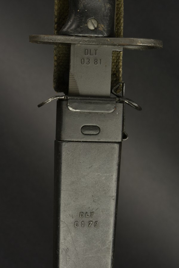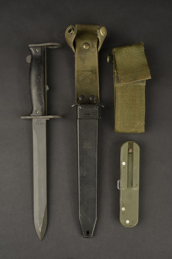 Casque français F1 housse de camouflage désert, lunettes et baïonnette Famas. Casque marqué GIAT ARS 1983, gilet pare éclats TTA F1 Daguet guerre du Golf en camouflage désert, daté 1990 avec sa notice, Moyenne Taille 96-106 cm, lunettes de protection avec filtre jaune, baïonnette et set de couverts incomplet II