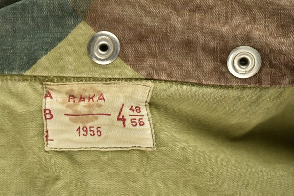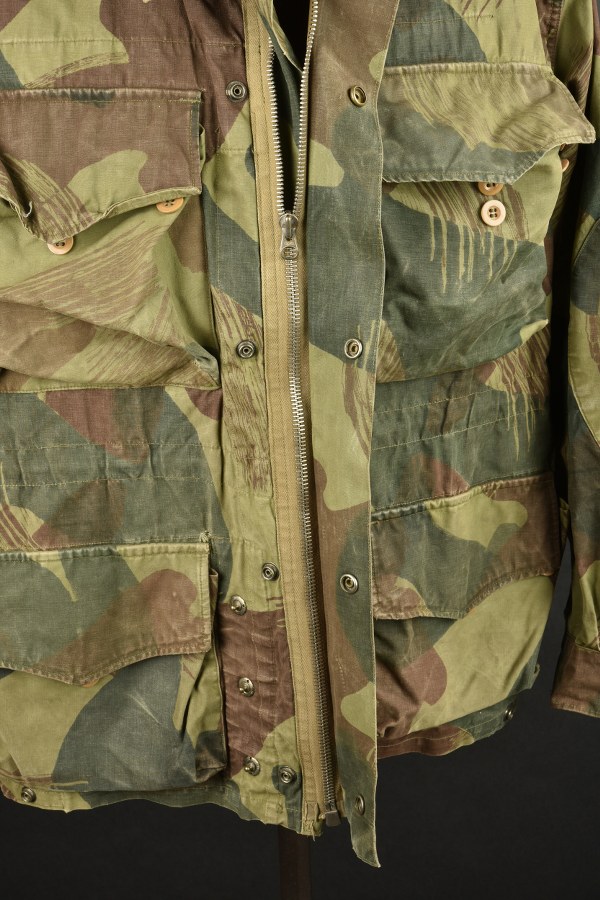 Veste de commando parachutiste belge type Denison Smock. Veste camouflée type Denison Smock avec queue de castor. Modèle avec fermeture des poches par boutons et boutonnières. Etiquette ABL 1956. Taille 4 48/56. Fermeture éclair fonctionnelle. Usure d'usage, couleurs fraiches. II+