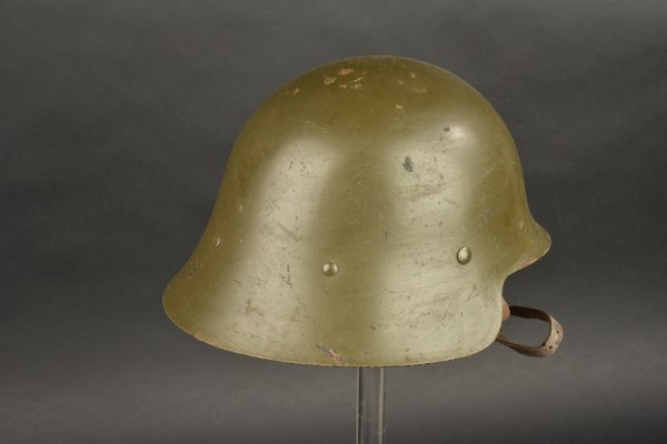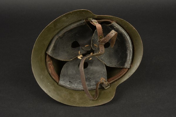 Espagne casque modèle 1926-1943. Casque ayant conservé sa coiffe noire d'origine. Pontet frontal pour insigne franquiste modèle 1943. Avec sa jugulaire. Usure, patine II