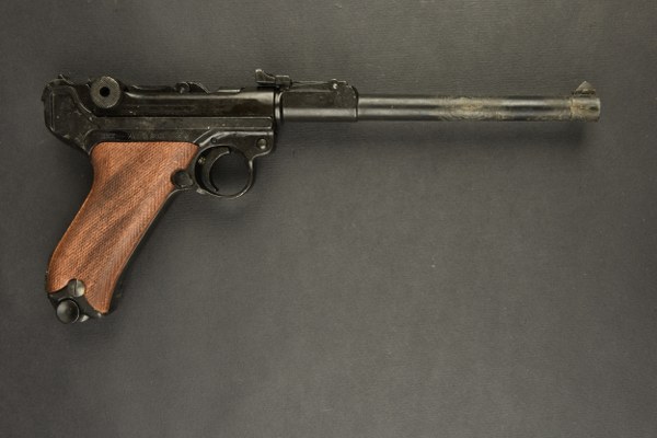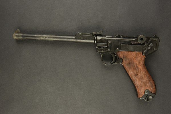 Etui de pistolet long avec réplique de Luger P08 artillerie. Etui cuir pour pistolet long, avec manchon en cuir souple et lacet sur le haut, déchirure d'un côté. Panneau de cuir rigide avec matelassure, sangle de transport. On y joint une réplique DENIX d'un Luger P08 d'Artillerie II