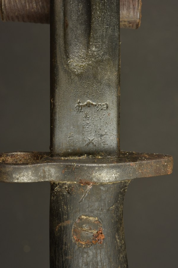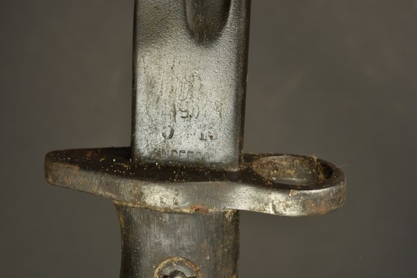 Baïonnette anglaise M 1907 avec porte fourreau cuir. Baïonnette type 1907, lame usée et rebronzée, marquages peu lisible fabricant Sanderson date 1916. Poussoir à débloquer. Fourreau cuir et fer avec bouton de chape rond. Porte fourreau cuir pattern 1914 sans patelette au dos pour personnels autre qu'infanterie. Usure, patine. II