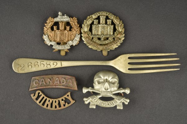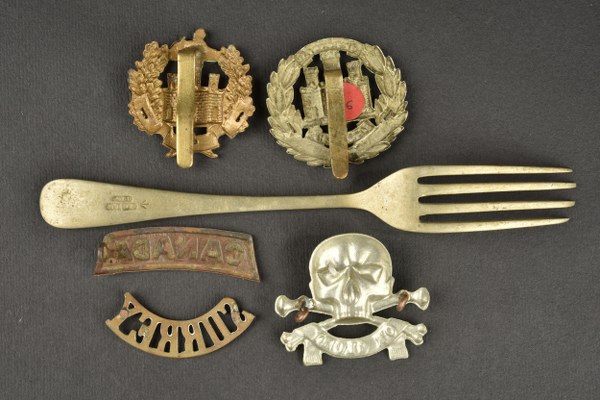 Lot anglais WW1. Constitué d'un porte fourreau en Web, une bouteille HP Sauce, un Jack Knife, une fourchette avec matricule et une plaque de chariot de 1915. Un bidon, 3 cap badges et 2 titres d'épaule. Usure, patine II